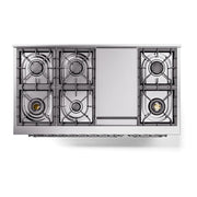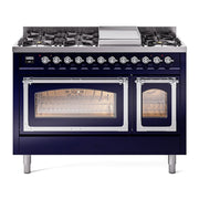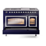 Introducing the new Nostalgie II 48 dual fuel range, a classic addition with a touch of innovation to any kitchen. The ilve nostalgie range 48 features sealed burners equipped with total black brass burners that have a non-stick nanotechnological coating, heavy cast iron grates, 3.5 + 1.52 cu. ft. total double oven capacity, and a soft closing door system.