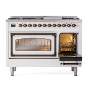 Introducing the new ILVE Nostalgie Range 48 dual fuel range, a classic addition with a touch of innovation to any kitchen. This range features sealed burners equipped with total black brass burners that have a non-stick nanotechnological coating, heavy cast iron grates, 3.5 + 1.52 cu. ft. total double oven capacity, and a soft closing door system.