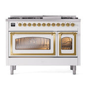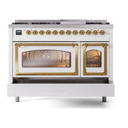 Introducing the new ilve nostalgie range 48 dual fuel range, a classic addition with a touch of innovation to any kitchen. This range features sealed burners equipped with total black brass burners that have a non-stick nanotechnological coating, heavy cast iron grates, 3.5 + 1.52 cu. ft. total double oven capacity, and a soft closing door system.