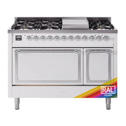 Introducing the new ILVE Nostalgie Range 48 dual fuel range, a classic addition with a touch of innovation to any kitchen. This range features sealed burners equipped with total black brass burners that have a non-stick nanotechnological coating, heavy cast iron grates, 3.5 + 1.52 cu. ft. total double oven capacity, and a soft closing door system.