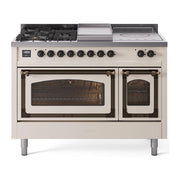 Introducing the new ILVE Nostalgie Range 48 dual fuel range, a classic addition with a touch of innovation to any kitchen. This range features sealed burners equipped with total black brass burners that have a non-stick nanotechnological coating, heavy cast iron grates, 3.5 + 1.52 cu. ft. total double oven capacity, and a soft closing door system.