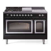 Introducing the new ILVE Nostalgie Range 48 dual fuel range, a classic addition with a touch of innovation to any kitchen. This range features sealed burners equipped with total black brass burners that have a non-stick nanotechnological coating, heavy cast iron grates, 3.5 + 1.52 cu. ft. total double oven capacity, and a soft closing door system.