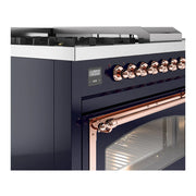 Introducing the new ILVE Nostalgie range 48 dual fuel range, a classic addition with a touch of innovation to any kitchen. This range features sealed burners equipped with total black brass burners that have a non-stick nanotechnological coating, heavy cast iron grates, 3.5 + 1.52 cu. ft. total double oven capacity, and a soft closing door system.