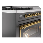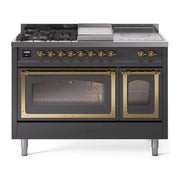 Introducing the new ilve nostalgie range 48, a classic addition with a touch of innovation to any kitchen. This dual fuel range features sealed burners equipped with total black brass burners that have a non-stick nanotechnological coating, heavy cast iron grates, 3.5 + 1.52 cu. ft. total double oven capacity, and a soft closing door system.
