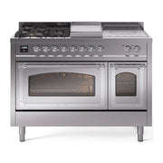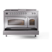 Introducing the new ILVE Nostalgie Range 48 dual fuel range, a classic addition with a touch of innovation to any kitchen. This range features sealed burners equipped with total black brass burners that have a non-stick nanotechnological coating, heavy cast iron grates, 3.5 + 1.52 cu. ft. total double oven capacity, and a soft closing door system.