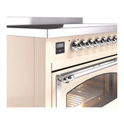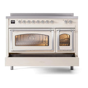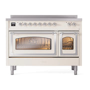 Introducing the new ILVE Nostalgie range 48 induction range, a classic addition with a touch of innovation to any kitchen. This range features 6 precise and efficient element zones with booster function, overheating and liquid spill protection, 3.5 + 1.52 cu. ft. dual oven capacity, and a soft closing door system.