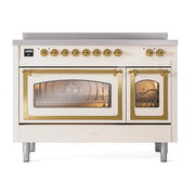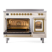 Introducing the new ilve nostalgie range 48, a classic addition with a touch of innovation to any kitchen. This range features 6 precise and efficient element zones with booster function, overheating and liquid spill protection, 3.5 + 1.52 cu. ft. dual oven capacity, and soft closing door system, blending timeless style with modern cooking performance.