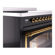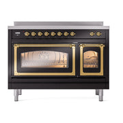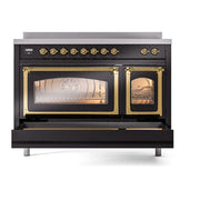 Introducing the new ILVE Nostalgie Range 48 induction range, a classic addition with a touch of innovation to any kitchen. This range features 6 precise and efficient element zones with booster function, overheating and liquid spill protection, 3.5 + 1.52 cu. ft. dual oven capacity, and a soft closing door system.