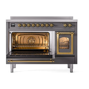 Introducing the new ILVE Nostalgie range 48 induction range, a classic addition with a touch of innovation to any kitchen. This range features 6 precise and efficient element zones with booster function, overheating and liquid spill protection, 3.5 + 1.52 cu. ft. dual oven capacity, and a soft closing door system, making it an ideal choice for modern cooking needs.