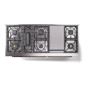 These burners provide optimal heat supply and perfect distribution for all types of cooking. They deliver powerful performance up to 25,000 BTU, allowing for precise control and efficient results in the ILVE Nostalgie 60.