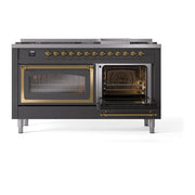 Introducing the new ILVE Nostalgie 60 dual fuel range, a classic addition with a touch of innovation to any kitchen. This range features sealed burners equipped with total black brass burners that have a non-stick nanotechnological coating, heavy cast iron grates, 3.5 + 2.3 cu. ft. dual oven capacity, and a soft closing door system.