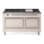 Introducing the new ilve nostalgie 60 dual fuel range, a classic addition with a touch of innovation to any kitchen. This range features sealed burners equipped with total black brass burners that have a non-stick nanotechnological coating, heavy cast iron grates, 3.5 + 2.3 cu. ft. dual oven capacity, and a soft closing door system.