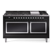 Introducing the new ilve nostalgie 60 dual fuel range, a classic addition with a touch of innovation to any kitchen. This range features sealed burners equipped with total black brass burners that have a non-stick nanotechnological coating, heavy cast iron grates, 3.5 + 2.3 cu. ft. dual oven capacity, and a soft closing door system.