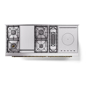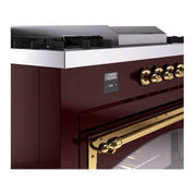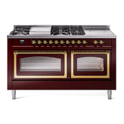 Introducing the new ilve nostalgie 60 dual fuel range, a classic addition with a touch of innovation to any kitchen. This range features sealed burners equipped with total black brass burners that have a non-stick nanotechnological coating, heavy cast iron grates, 3.5 + 2.3 cu. ft. dual oven capacity, and soft closing door system.