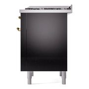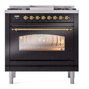 Introducing the new ILVE Nostalgie Range 36 dual fuel range, a classic addition with a touch of innovation to any kitchen. This range features sealed burners equipped with total black brass burners that have a non-stick nanotechnological coating, heavy cast iron grates, 3.5 cu. ft. total oven capacity, and a soft closing door system.
