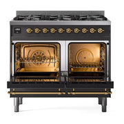 Introducing the new Nostalgie II ILVE 40 inch range Nostalgie, a classic addition with a touch of innovation to any kitchen. This range features sealed burners equipped with total black brass burners that have a non-stick nanotechnological coating, heavy cast iron grates, 2.3 + 2 cu. ft. dual oven capacity, and a soft closing door system, blending timeless style with modern efficiency for effortless cooking.