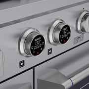• Dual Oven Configuration – Main oven features heavy-duty blue porcelain interior with 5.2 cu. ft. capacity; side oven offers 3.3 cu. ft. for simultaneous cooking.